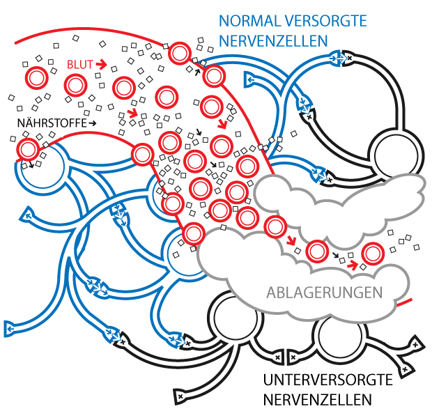 Blutgefäße werden durch Blutzucker-Ablagerungen geschädigt. Die Blutgefäße können ihre Aufgabe, die Versorgung der Nervenzellen, nicht mehr leisten. Die Nervenzellen sterben ab und können daher keine Signale mehr übertragen.
