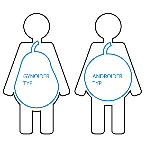 Verteilt sich das Fettgewebe hauptsächlich am Körperstamm (sog. androider Typ oder "Apfeltyp"), ist das Gesundheitsrisiko deutlich höher als bei einer Fettkonzentration an Hüften und Oberschenkeln (sog. gynoider Typ oder "Birnentyp").Übergewicht