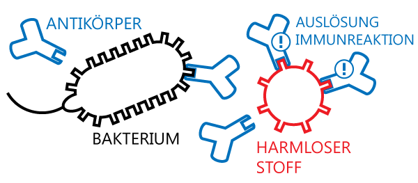 Fremde Stoffe (z.B. Bakterien oder Viren) dringen in den Körper ein. Die wie ein "Y" geformten Antikörper erkennen sie an ihren Oberflächenstrukturen und heften sich an. Weisse Blutkörperchen (Lymphozyten) erkennen die Verbindung aus körperfremden Stoff und Antikörper und vernichten sie.Allergie