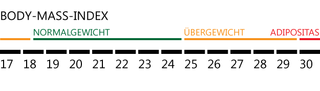 Bei normalgewichtigen Personen liegt diese Kennzahl zwischen 18,5 und 24. Bei einem Body-Maß-Index von über 25 spricht man von Übergewicht. Patienten mit einem Body-Maß-Index von über 30 leiden unter Adipositas.Body-Mass-Index