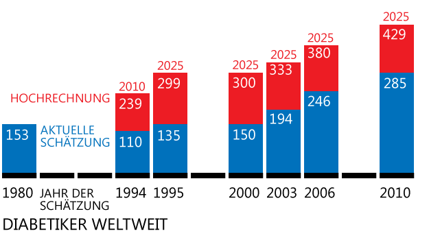 Diabetes mellitus – vorwiegend bezogen auf den Typ 2 – ist zu einer weltweit verbreiteten Massenerkrankung geworden. Die weltweiten Zahlen (Hochrechnungen) steigen rasch an und die Vorhersageschätzungen werden immer wieder nach oben revidiert.Alles über Diabetes