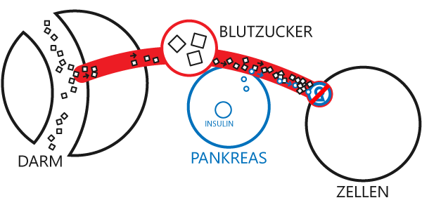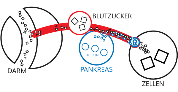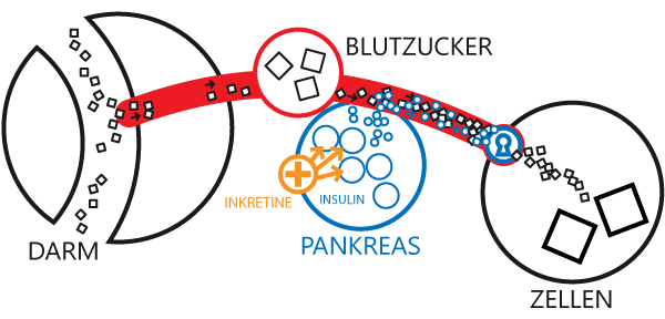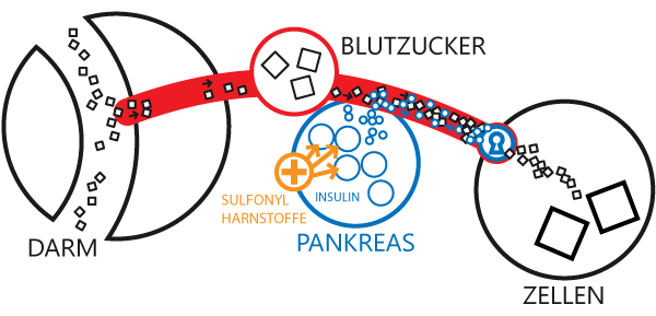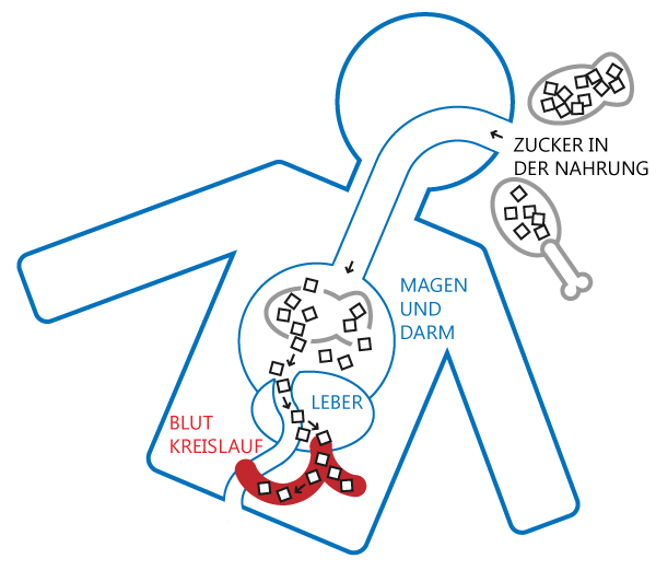 Zucker wird im Magen-Darm-Trakt aus der Nahrung abgespalten und über die Leber in das Blut aufgenommen. Von dort gelangt der Zucker zu den Körperzellen.Medikamentöse Therapie