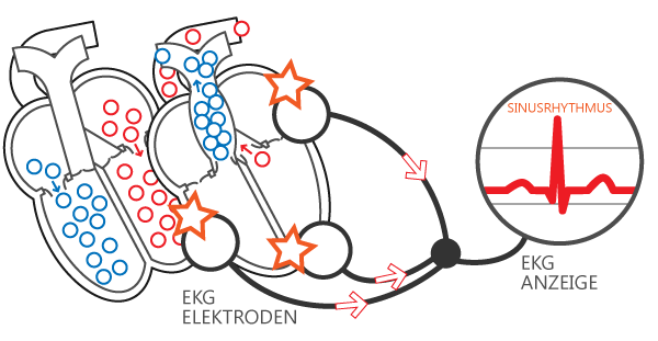 Der Herzschlag wird im Körper mit elektrischen Strömen gesteuert. Diese können mit dem EKG gemessen werden.Elektrokardiogramm