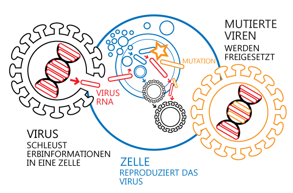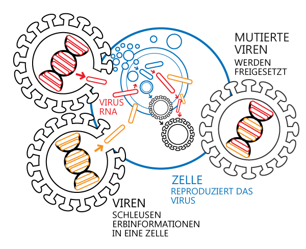 Beim Kopieren des Virus-Erbguts tritt eine zufällige Mutation auf. Das Virus verändert sich dadurch und gewinnt so neue Eigenschaften.H1N1-Virus