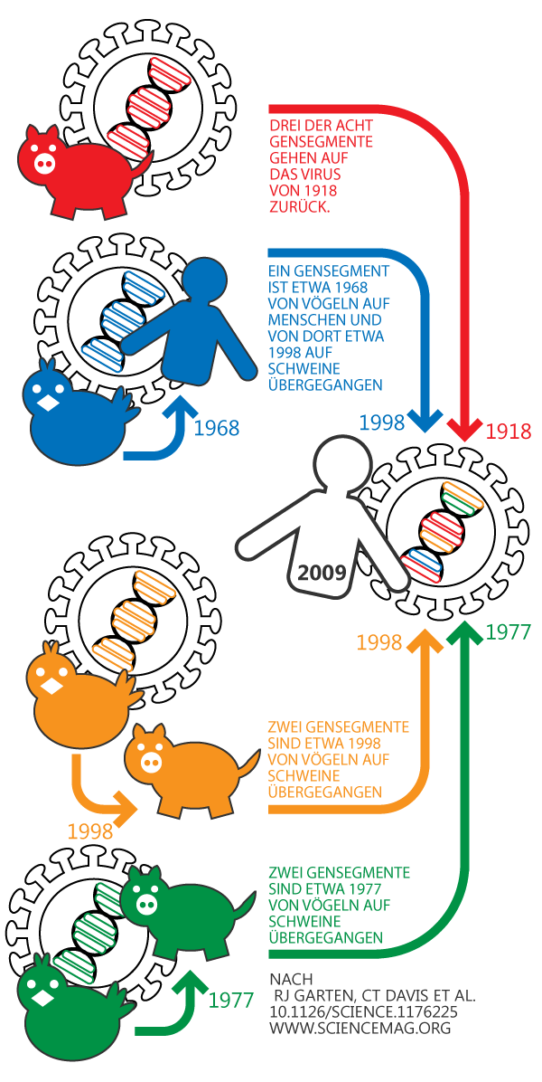Beim neuen H1N1-Virus handelt es sich um eine so genannte Vierfachkombination. Das Virus vereinigt in sich eine Kombination von Erbgut aus vier verschiedenen Entstehungslinien.H1N1-Virus