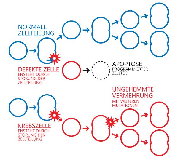Bei einer Krebserkrankung ist der Reparaturmechanismus der Zellen gestört. Zellen mit fehlerhaften Informationen werden nicht repariert und können sich ungehindert weitervermehren, so dass es in der nächsten Zellgeneration zu weiteren Defekten kommen kann.Krebs
