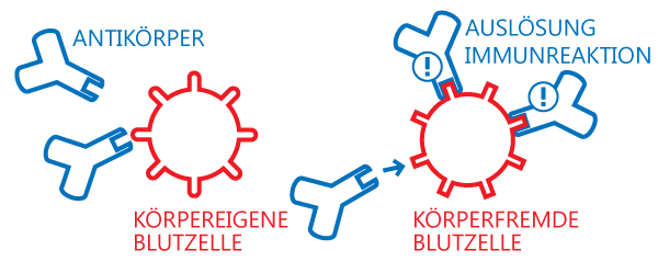 Die fremden Blutzellen werden anhand ihrer Oberfläche als körperfremd erkannt. Es bildet sich eine Immunreaktion, welche die fremden Zellen zerstört.Immunsystem